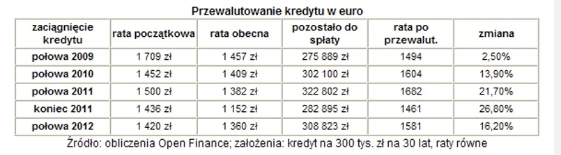 Ale nawet uwzględniając niższy spread (do obliczeń uwzględniliśmy 1-proc. prowizję) okazuje się, że zmiana waluty z euro na złote zawsze oznaczać będzie wzrost raty. Najmniejszy będzie w przypadku kredytu zaciągniętego w połowie 2009 r. Kurs EUR/PLN wynosił wówczas 4,5, a średnia marża kredytu w euro to 3,7. Po przewalutowaniu takiego kredytu na złote (z marżą 1,6 p.p.) rata wzrośnie o 2,5 proc. W przypadku kredytu na 300 tys. zł będzie to wzrost o 37 złotych. W pozostałych analizowanych przypadkach wzrost wynosić będzie co najmniej kilkanaście procent. Najwięcej zmieniłaby się rata kredytu z końca 2011 r., bo choć kurs EUR/PLN przekraczał wówczas 4,55, to marże były niskie (2 p.p.), co sprawia, że przy przewalutowaniu znacznie wzrosłoby oprocentowanie takiego kredytu, a miesięczna rata powiększyłaby się o prawie 27 proc.