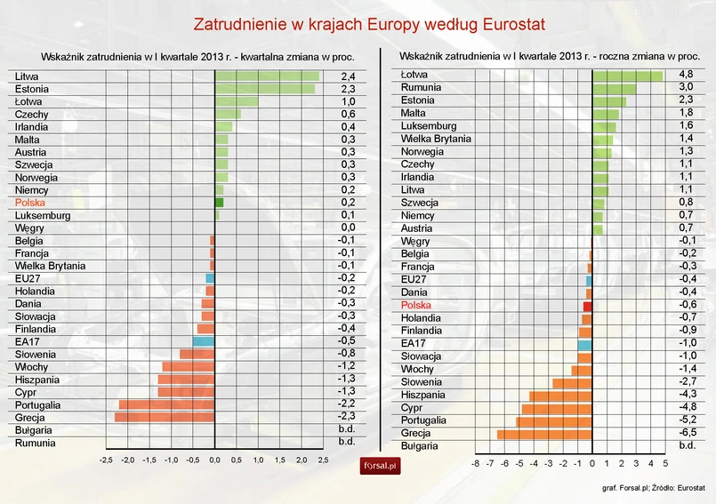 Najmocniejszy wzrost zatrudnienia w I kwartale 2013 r. w porównaniu do IV kwartału 2012 r. zanotowała Litwa – ilość zatrudnionych osób podskoczyła tu o 2,4 proc. Na drugim miejscu znalazła się Estonia (2,3 proc.) oraz Łotwa (1 proc.).