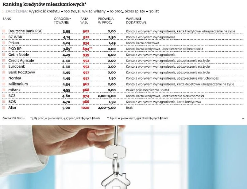 Jak wygląda dziś oferta banków? Dom Kredytowy Notus przygotował porównanie ofert w wysokości 190 tys. zł na 30 lat przy założeniu 10-proc. wkładu własnego klienta.