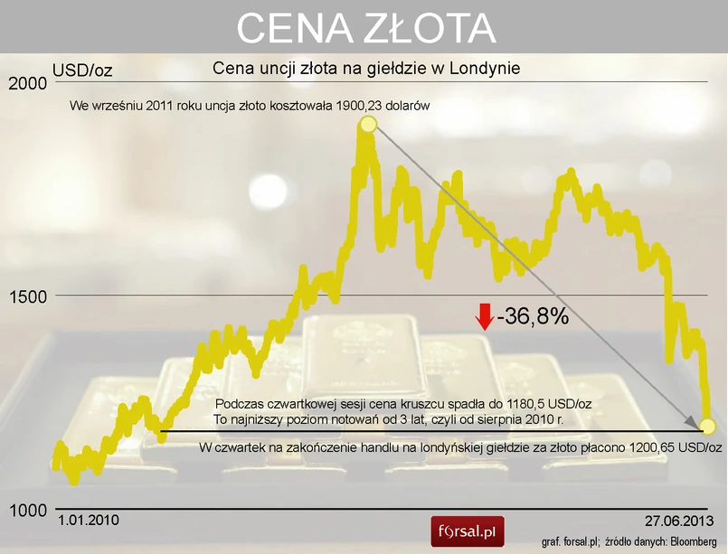 W czwartek cena uncji złota spadła w pewnym momencie do poziomu 1180,5 USD, najniższego od sierpnia 2010 r. Później cena wróciła już ponad poziom 1200 USD. Od początku kwietnia ceny bulionu spadły o 25 proc. – jest to skutek spodziewanego ograniczenia przez amerykańską Rezerwę Federalną programu pomocy dla gospodarki.