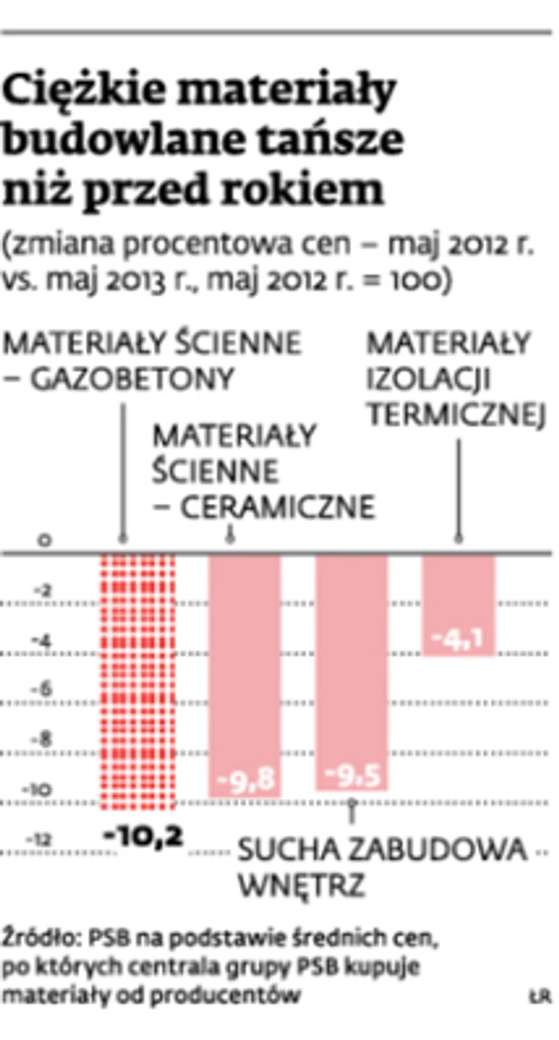 Dane PSB wskazują, że średnie ceny niektórych ciężkich materiałów w maju tego roku były nawet o ok. 10 proc. niższe niż przed rokiem. Średni spadek dla wszystkich grup produktów wyniósł 3,3 proc. Firma opiera się jednak tylko na cenach, po których sama kupuje materiały. Doniesienia z branży wskazują na jeszcze głębsze spadki. Koelner, producent mocowań, deklaruje, że o ile w tym segmencie ceny w stosunku do 2012 r. spadły o kilka procent, o tyle cięcia na rynku cegieł, włączając rabaty i upusty, wyniosły nawet kilkanaście procent.