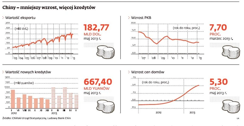 Pod koniec maja Międzynarodowy Fundusz Walutowy obniżył prognozę na ten rok dla Chin z 8,4 proc. do 7,7 proc. W I kw. br. chińska gospodarka już zresztą spowolniła do tego poziomu i według analityków na tym może się nie skończyć. Zhiwei Zhang z banku Nomura szacuje, że jest 30-proc. prawdopodobieństwo, iż w III bądź IV kw. spadnie nawet poniżej 7 proc. W marcu nowe kierownictwo partii z prezydentem Xi Jinpingiem i premierem Li Keqiangiem na czele założyło, że tegoroczny wzrost ma osiągnąć 7,5 proc. PKB, co uznano za bezpieczny, łatwy do osiągnięcia poziom. Tymczasem Xi Jinping niedawno powiedział, że poziom wzrostu gospodarczego nie powinien być jedynym kryterium oceny urzędników.