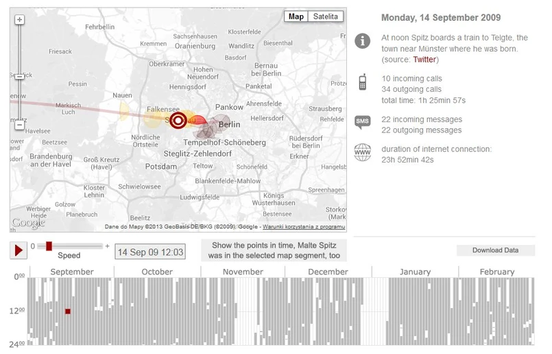 Następnie w lutym 2011 roku Malte Spitz udostępnił dane niemieckiemu serwisowi Zeit.de. Zeit na podstawie danych o geolokalizacji oraz informacji z postów na Twitterze, wpisów na blogu i stron internetowych sporządził zapis aktywności polityka w ciągu 6 miesięcy. Widać na nim, gdzie i o jakiej godzinie przebywał Malte Spitz, dokąd podróżował, kto do niego dzwonił, jak długo trwała rozmowa, kiedy Spitz łączył się z internetem i jak długo trwało połączenie.