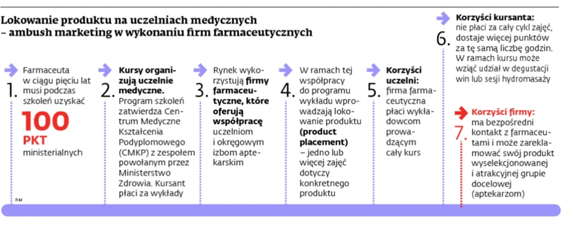 Prawo do prowadzenia szkoleń mają akredytowane uczelnie medyczne. Część weszła w układ z firmami farmaceutycznymi, które występują w roli sponsorów. Opłacają np. wykładowców, dzięki czemu mogą wpływać na program.