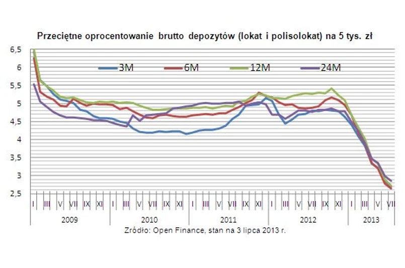 Od szczytu przypadającego na październik ubiegłego roku średnie oprocentowanie lokat spadło o 2-2,7 pkt proc. w zależności od czasu trwania depozytu. W tym samym czasie stopa referencyjna została obniżona z 4,75 do 2,75 proc., a stawka rynku międzybankowego WIBOR 3M zmniejszyła się o ok. 2,2 pkt proc. do 2,72 proc. Najwięcej straciły lokaty roczne (-2,7 pkt proc.) i półroczne (-2,52 pkt proc.), najmniej zaś dwuletnie (-2 pkt proc.) i kwartalne (-2,11 pkt proc.).