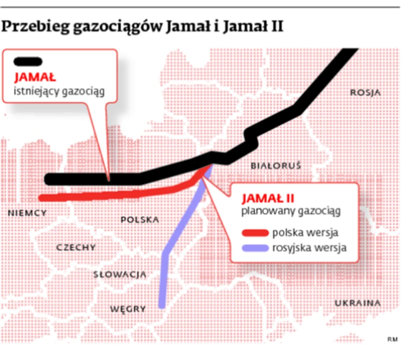 Jak się dowiedzieliśmy nieoficjalnie ze źródeł zbliżonych do Gazpromu, koncern nie akceptuje takiej definicji. W punkcie 1 artykułu 3 umowy międzyrządowej z 1993 roku czytamy: „Na terytorium Rzeczpospolitej Polskiej budowany będzie system gazociągów tranzytowych o docelowej zdolności przesyłu gazu ziemnego do 67 mld m sześc. rocznie (moc przesyłowa istniejącej nici wynosi 33 mld m sześc. – red.). Wejście gazociągu na terytorium Rzeczpospolitej Polskiej w rejonie miejscowości Kondratki na granicy białorusko-polskiej i wyjście w rejonie miejscowości Górzyca na granicy polsko-niemieckiej. Przewidywana jest możliwość budowy odgałęzienia gazociągu w kierunku południowo-zachodnim”. Zdaniem rozmówcy w Gazpromie taka definicja jednoznacznie wskazuje, czym jest Jamał II.