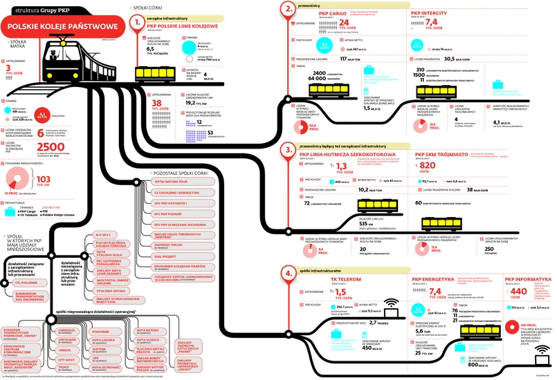 Świat PKP jest hermetyczny, bo żadnej ze spółek – a jest ich 50 – nie można zrozumieć bez powiązania z pozostałymi. Podmiotem dominującym jest spółka matka PKP, której podlegają spółki córki obsługujące przewozy pasażerskie (PKP Intercity i SKM Trójmiasto), towarowe (PKP Cargo i LHS) oraz infrastrukturę kolejową: PKP Polskie Linie Kolejowe, TK Telekom, PKP Energetyka i PKP Informatyka. Te spółki to twarde jądro PKP, które stanowi bazę do podawania wyników grupy – perłą w koronie jest PKP Cargo (267 mln zł zysku netto w 2012 r.). Na przeciwległym biegunie znajduje się zarządca torów PKP PLK, który tylko w ubiegłym roku przyniósł 700 mln zł strat, a od 10 grudnia wyłączy z ruchu prawie tysiąc z 19 tys. km torów. PKP są też właścicielem tak egzotycznych spółek, jak: biuro podróży KPTW Natura Tour czy CS Szkolenie i Doradztwo.