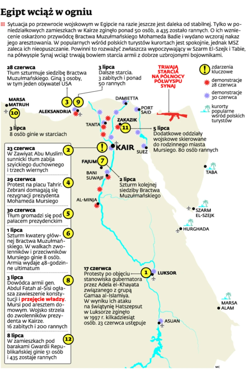 O ich wzniecenie oskarżono przywódcę Bractwa Muzułmańskiego Mohameda Badie i wydano wczoraj nakaz jego aresztowania. W popularnych wśród polskich turystów kurortach jest spokonie, jednak MZS zaleca ich nieopuszczanie. Powinni to rozważyć zwłaszcza wypoczywający w Szarm El-Szejk i Tabie, na półwyspie Synaj wciąż trwają bowiem starcia armii z dobrze uzbrojonymi bojownikami.