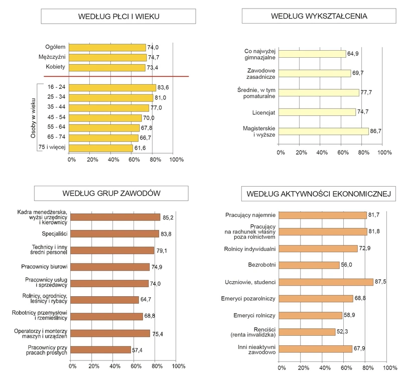 Główny Urząd Statystyczny dokonał podziału również ze względu na charakter aktywności ekonomicznej. Z badań urzędu wynika, że największą satysfakcję z życia czerpią studenci – zadowolonych jest aż 87,5 proc. z nich. Wskaźnik zadowolenia z życia kształtuje się podobnie dla pracowników na etacie i pracujących na własny rachunek, ale poza rolnictwem – wynosi on nieco poniżej 82 proc. Spośród ankietowanych rolników indywidualnych za zadowolonych uznało się 72,9 proc. Najmniej zadowoleni są bezrobotni (56 proc.) oraz osoby z rentą inwalidzką (52 proc.).