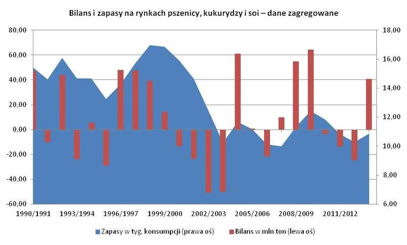 Niskie zapasy, będące efektem trzech z rzędu sezonów z deficytem na rynku surowców rolnych, silne spadki cen od początku tego roku oraz względnie niewysoki poziom długich spekulacyjnych pozycji netto sprawiają, że szanse na dalsze spadki cen pszenicy i kukurydzy są nieduże. W przypadku kolejnych rewizji prognoz w dół przez USA jest szansa wręcz na silniejsze odbicie cen surowców rolnych.