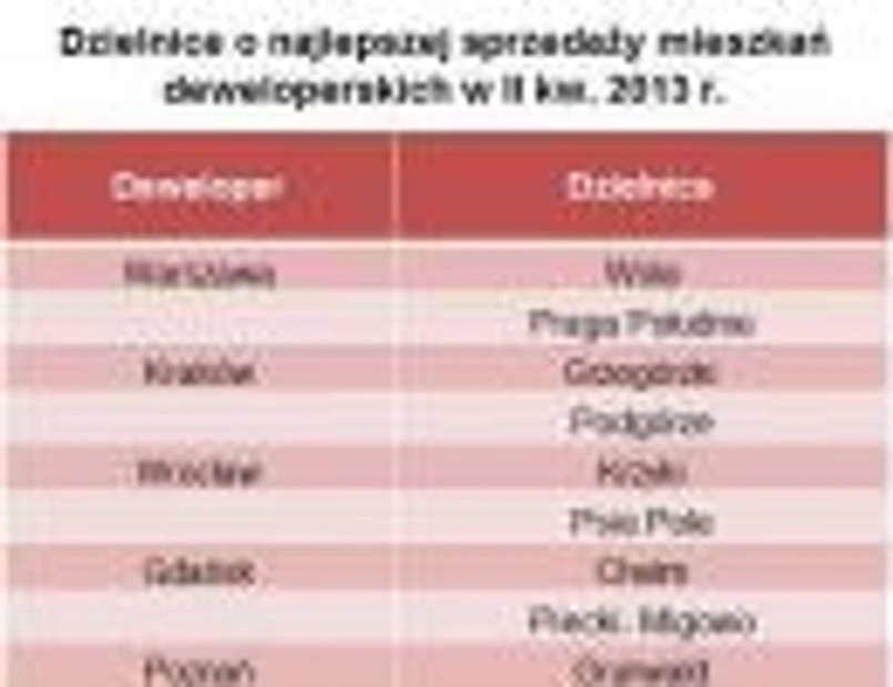 W tabeli zamieszczono zestawienie przedstawiające dzielnice pięciu miast będących największymi rynkami deweloperskimi w kraju, które w II kw. 2013 r. charakteryzowały się największym poziomem sprzedaży mieszkań na rynku pierwotnym.