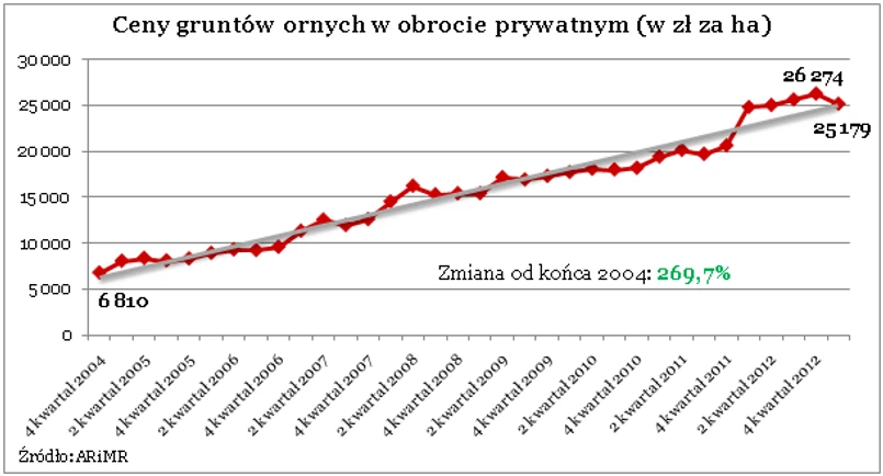 Najnowsze dane GUS pokazują, że ceny gruntów ornych po raz pierwszy od sześciu kwartałów spadły. W pierwszym kwartale br. za hektar trzeba było zapłacić przeciętnie 25,2 tys. zł, podczas gdy kwartał wcześniej było to 26,3 tys. zł – wynika z danych GUS opublikowanych przez Agencję Restrukturyzacji i Modernizacji Rolnictwa. Bieżący wynik jest dokładnie o 1095 zł niższy niż kwartał wcześniej. Zmiana ta oznacza kwartalny spadek cen o 4,2%. Biorąc jednak pod uwagę cały okres, za który dostępne są dane o cenach ziemi w obrocie prywatnym, wzrost można oszacować na 269,7%. O tyle właśnie zdrożał średnio hektar gruntu od końca 2004 roku do I kwartału 2012 roku. Średnioroczny wzrost cen gruntów wyniósł w tym okresie 17,8%.