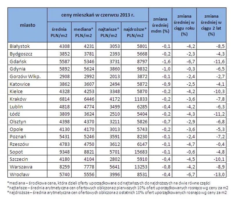 Zdecydowanie większe wartości wyrażają spadki cen, jakie nastąpiły w analizowanych miastach w dłuższych przedziałach czasowych – na przestrzeni ostatniego roku i dwóch lat. W porównaniu z czerwcem 2012 roku najbardziej spadły ceny mieszkań w Gdańsku i we Wrocławiu (po 6.7 proc.); najmniej w Sopocie (0,6 proc.) i Gdyni (0,3 proc.). Liderem spadków z ostatnich 2 lat jest Wrocław – obecna średnia ofertowa – 5740 zł/m2 – jest o 13 proc. niższa niż w czerwcu 2011 roku. Najmniej – tylko o 0,4 proc. - spadła przez ten czas średnia cena w Rzeszowie.