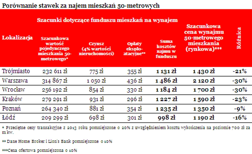 Zgodnie z przedstawionym wczoraj projektem, fundusz ma wynajmować mieszkania z rentownością 4% netto. Łatwo więc obliczyć, że przeciętny czynsz dla funduszu wyniesie nieco ponad 833 zł. Do tej kwoty wynajmujący będzie musiał jednak dodać opłaty eksploatacyjne. Ich wysokość można szacować w przypadku 50-metrowego mieszkania na kolejne 400 – 500 zł miesięcznie, co daje łączny czynsz na poziomie 1200 – 1300 zł. Oczywiście należy mieć świadomość, że stawki najmu mogą być mocno zróżnicowane terytorialnie. Można jednak szacować, że sześciu miastach, w których program ma ruszyć w przyszłym roku, czynsze przeciętnie o ok. 20% niższe niż dzisiejsze stawki rynkowe.