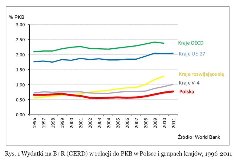 Pod względem wydatków na badania i rozwój w relacji do PKB Polska w 2011 roku znajdowała się nie tylko poniżej poziomu średniej dla krajów UE i OECD, ale również poniżej średniej dla krajów rozwijających się i czterech państw Grupy Wyszehradzkiej (V-4). Średnia dla krajów OECD w 2011 roku wyniosła 2,4 proc. PKB, dla UE – 2,04 proc. PKB, podczas gdy w Polsce tylko 0,77 proc. PKB. Szczególnie niepokojący może być dla nas fakt, że jeszcze w latach 1996-2000 poziomy wydatków na badania i rozwój w krajach rozwijających się i krajach Grupy Wyszehradzkiej były na podobnym poziomie, jednak już w pierwszej dekadzie 21. wieku różnice zaczęły się pogłębiać na niekorzyść Polski (zobacz wykres).