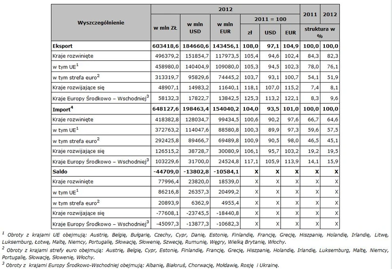 GUS podał wcześniej, że w całym 2012 r. eksport wzrósł o 3,8 proc., zaś import zmniejszył się o 0,6 proc.