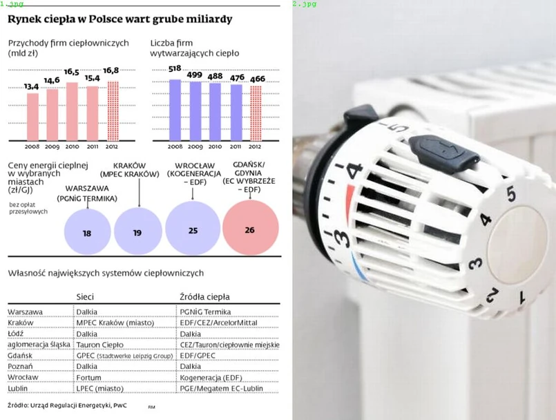 Choć branża liczy sobie 466 przedsiębiorstw, największy strumień pieniędzy za wytwarzanie, dystrybucję i obrót ciepłem płynie do garstki gigantów. Biznesem rządzą francuskie Dalkia (Warszawa, Łódź, Poznań) i EDF (Wrocław, Gdańsk, Zielona Góra, Kraków) oraz kontrolowane przez Skarb Państwa PGNiG Termika (Warszawa) i Tauron (aglomeracja śląska). Liczy się także fiński Fortum (Wrocław, Częstochowa).