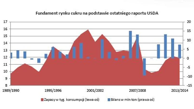 Jednakże ostatnie prognozy Amerykańskiego Departamentu Rolnictwa z maja tego roku (prognozy dla rynku cukru publikowane są przez USDA dwa razy w roku – listopadzie i maju) zakładają stabilizację podaży i spadek nadprodukcji z 10 mln ton do ok. 7 mln ton w sezonie 2013/14. Niewykluczone nawet, że ostatnie doniesienia o słabych zbiorach trzciny cukrowej w Indiach i Tajlandii doprowadzą do spadku nadpodaży surowca w tym sezonie nawet w okolice zera oraz spadku zapasów mierzonych w tygodniach konsumpcji. Ponadto poziom zapasów nie jest przesadnie wysoki – pierwsze lata nadwyżki spowodowały jedynie ich odbudowanie po kryzysie podaży.