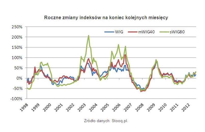 Takie różnice w zachowaniu poszczególnych indeksów nie są niczym nadzwyczajnym. W połowie 2007 roku, u szczytu hossy, sWIG80 w skali roku notował wzrost o przeszło 150 proc. W tym czasie mWIG40 mógł się pochwalić zwrotem rzędu 125 proc., a WIG nieco ponad 60 proc. Wiosną 2004 roku zdarzyło się nawet, że roczna stopa zwrotu z indeksu małych spółek przekroczyła 200 proc., podczas gdy w przypadku średnich spółek było to niespełna 100 proc., a przy WIG-u ponad 70 proc. Podczas spadków zarówno „maluchy” jak i „średniaki” także wyprzedzają WIG, notując większe straty, choć wówczas różnice wyrażane w punktach procentowych nie są już tak duże. Jak pokazuje poniższy wykres, podczas wzrostów indeksy małych (kolor zielony) i średnich (kolor czerwony) spółek rosną szybciej niż WIG (kolor niebieski), i na odwrót, podczas spadków zazwyczaj tracą więcej. Jednocześnie nie trudno zauważyć, że mniej więcej od 2008 roku wszystkie te trzy wskaźniki poruszają się w zgodnym rytmie, a ewentualne rozbieżności nie są już tak wyraźne, jak bywało to wcześniej.