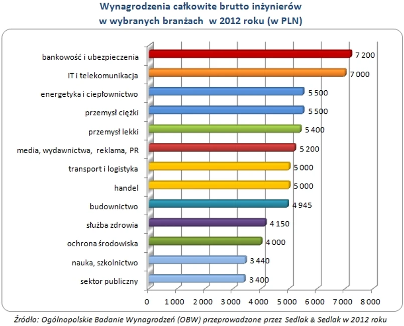 Najwyższymi zarobkami w 2012 roku mogli poszczycić się inżynierowie zatrudnieni w bankowości i ubezpieczeniach. Według danych zebranych przez Sedlak & Sedlak, mediana ich wynagrodzeń wynosiła 7 200 zł brutto. Na drugim miejscu pod względem wysokości zarobków uplasowała się branża IT i telekomunikacja (7 000 zł).