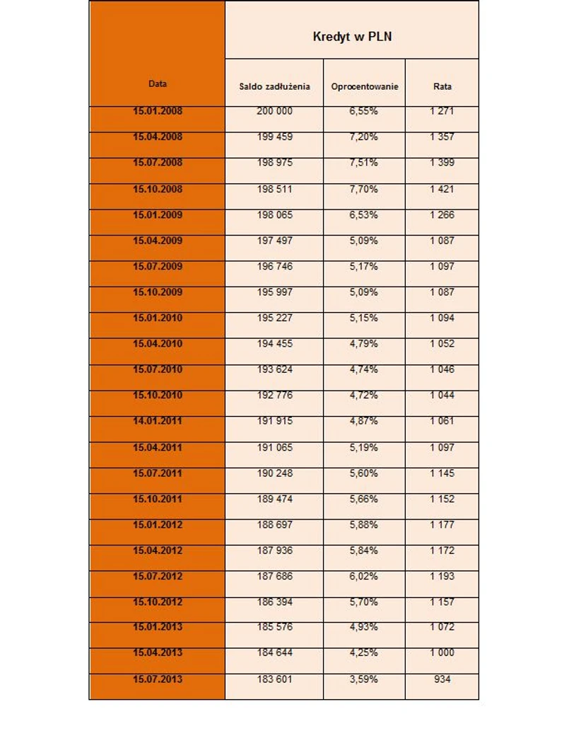 Spadającą ratę szczególne odczuwają kredytobiorcy, którzy zaciągnęli swoje kredyty w 2008 roku lub wcześniej. Prawie 5 lat temu Wibor 3 miesięczny notowany był na poziomie pond 6,85 proc., co przekładało się na bardzo wysokie raty kredytów złotowych. Przykładowo osoba, która zaciągnęła kredyt w styczniu 2008 roku, jesienią tego samego roku płaciła ratę wyższą od pierwotnej o ponad 10 proc. W październiku 2008 roku, tuż po wybuchu kryzysu hipotecznego na polskim rynku raty kredytów w złotych były najwyższe w historii.