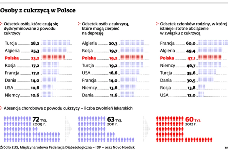 Z badania zrealizowanego przez Międzynarodową Federację Diabetologiczną i firmę Novo Nordisk wynika również, że blisko 60 proc. chorych odczuwa silny stres z powodu choroby. Polska zajęła niechlubne drugie miejsce pod względem liczby cukrzyków z depresją – przyznaje się do niej ponad 19 proc. osób. Eksperci mówią, że to przede wszystkim efekt trudności, z którymi spotykają się osoby z tą chorobą na drodze zawodowej.