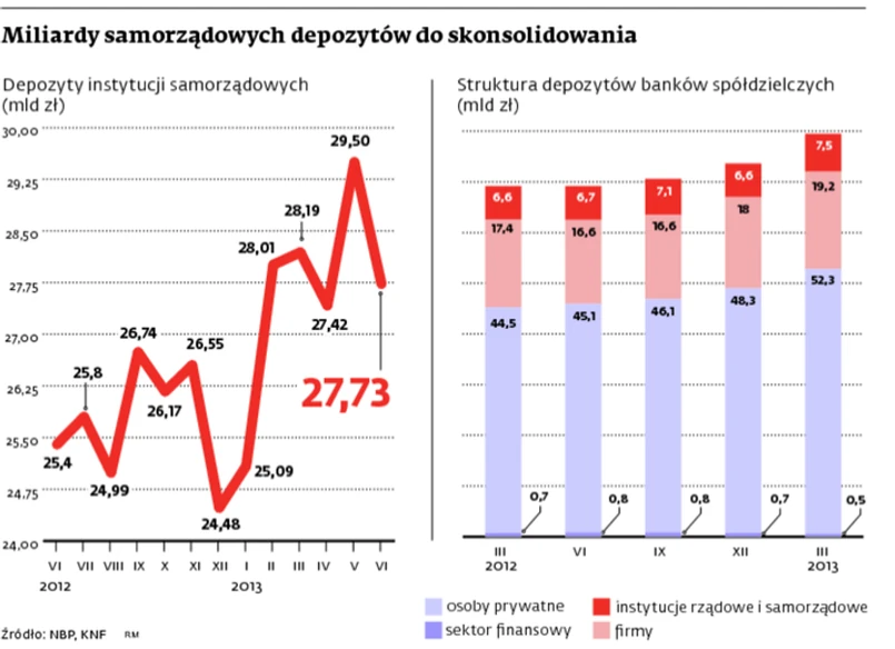 Nawet jeśli samorządy potraktują konta w BGK jako dodatkowe rachunki i nie przeniosą się do państwowego banku, to i tak z banków komercyjnych może odpłynąć ponad 10 mld zł. Tyle wynosiła wartość lokat na koniec ub.r. w instytucjach, które nowa ustawa zobowiązuje do lokowania środków na depozycie resortu. Projekt wymienia m.in. państwowe instytucje kultury, uczelnie publiczne, samodzielne publiczne zakłady opieki zdrowotnej czy PAN. Konsolidacji będą podlegały też depozyty sądowe (2,6 mld zł na koniec 2012 r.), które sądy przyjmują od stron postępowań, np. z tytułu wpłacanego wadium.