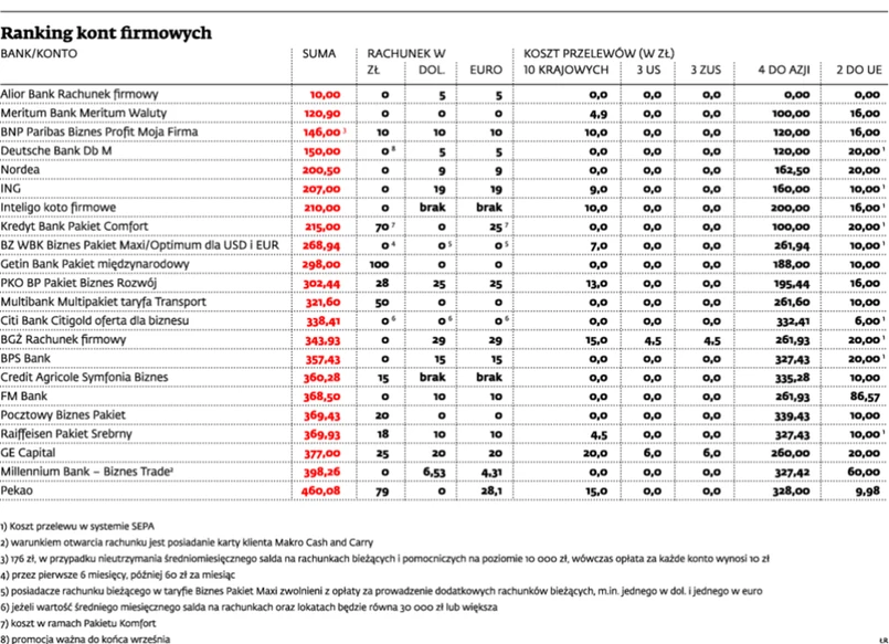 Analitycy porównywarki Comperia, dokonując analizy bankowych ofert, dokonali obliczeń dla przykładowej firmy, która wykonuje miesięcznie dziesięć przelewów krajowych, trzy przelewy do urzędu skarbowego, trzy przelewy do Zakładu Ubezpieczeń Społecznych, cztery przelewy zagraniczne do kontrahentów znajdujących się w Azji o wartości 10 tys. dol. każdy i dwa przelewy do partnerów handlowych z siedzibą na terenie Unii Europejskiej o wartości 5 tys. euro każdy. Dodatkowymi kryteriami oceny były koszty prowadzenia firmowych rachunków w złotych, dolarach amerykańskim oraz w euro. Założono, że wszystkie operacje są wykonywane przez internet. Kursem przeliczeniowym był stosunek wymiany polskiego złotego na dolara lub euro, podany przez Narodowy Bank Polski na dzień sporządzenia zestawienia. – Jednak w kilku przypadkach koszty zostały od razu przeliczone przez banki po ich kursie wymiany. Pomimo pewnych różnic względem kursu