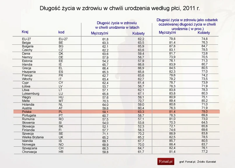 Według ostatnich dostępnych kompleksowych danych Eurostatu za 2011 rok , przeciętny Europejczyk od momentu narodzin mógł przeżyć w zdrowiu 61,8 lat, a Europejka – 62,2 lat (średnia dla całej UE). To odpowiednio 80 proc. i 75 proc. średniej długości życia mężczyzn i kobiet w UE.