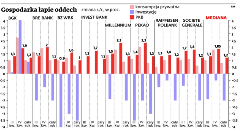 Eksperci, z którymi rozmawialiśmy, spodziewają się, że konsumpcja w III kw. wzrośnie o ok. 1 proc., a w IV – o 1,8 proc. Poprawić się mają też inwestycje. Nadal będą na minusie, ale już nie tak dużym jak pod koniec ubiegłego i na początku tego roku (spadki o 4,1 proc. i 2 proc.). W III kw. mają się one zmniejszyć o 1,9 proc., a w IV spadek wyhamuje do 0,5 proc.