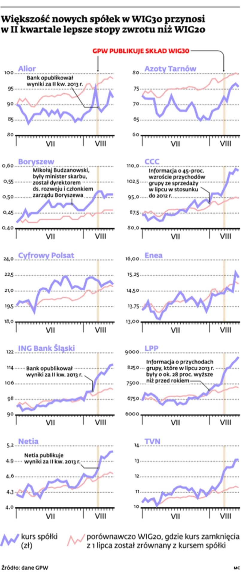 – Nie sądzę, aby pierwsza publikacja indeksu jeszcze podbiła kursy nowych firm w WIG30. Ta informacja już jest uwzględniona w ich cenach. Na razie obecność w indeksie będzie miała dla spółek raczej charakter prestiżowy i nie będzie specjalnie przekładać się na większe zainteresowanie inwestorów ich papierami – ocenia Błażej Bogdziewicz, wiceprezes Caspar Asset Management.