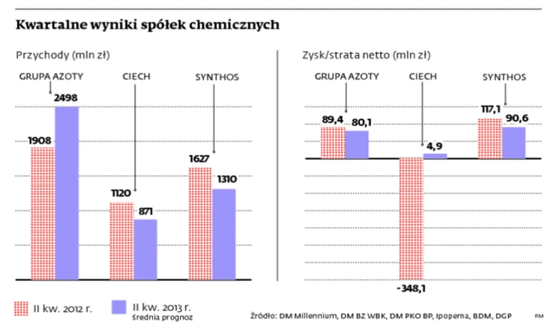 Z trudną sytuacją rynkową boryka się także Grupa Azoty. II kw. będzie pierwszym, w którym spółka w pełni skonsoliduje wyniki Puław (dodadzą one do skonsolidowanego wyniku ponad 1 mld zł przychodów). Analitycy prognozują jednak, że wynik netto grupy spadnie o ponad 9 mln zł. Wchodzące w skład grupy ZA Puławy musiały ciąć marże, bo ceny produkowanego przez nie kaprolaktamu (stosowanego w przemyśle żywic i tworzyw) spadały, wykorzystywanego do jego wytwarzania benzenu zaś – rosły. Nie bez wpływu na wynik będą również niskie ceny nawozów (spadły rok do roku o kilkanaście procent). Analitycy Ipopemy twierdzą, że segment nawozowy Polic (zakład wchodzący w skład Grupy Azoty) wygeneruje ponad 32 mln zł straty operacyjnej. W sumie cała grupa może zarobić – według szacunków – ok. 80 mln zł.