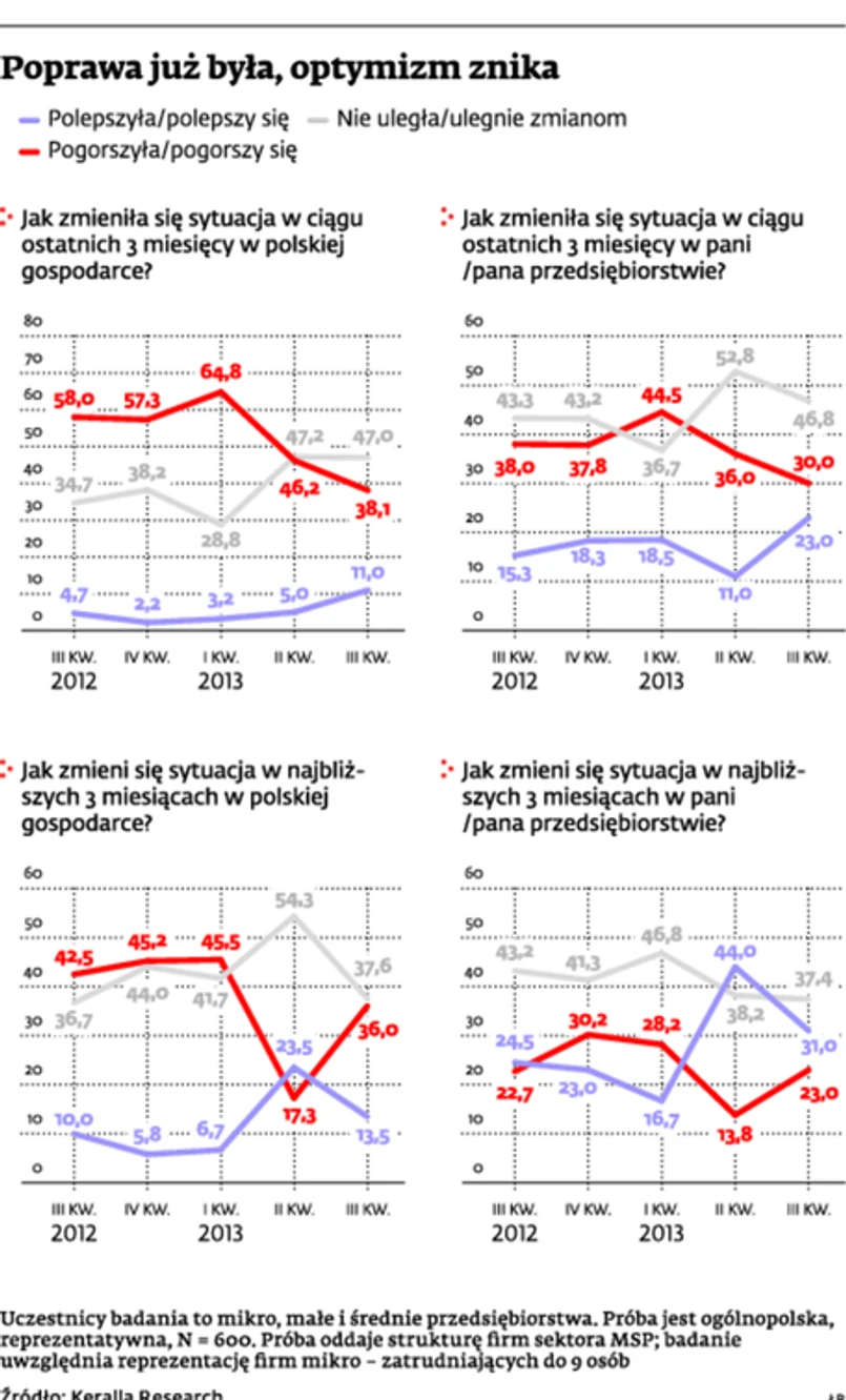 Zaledwie 2 proc. przedsiębiorców ankietowanych w cokwartalnym badaniu przez Instytut Keralla Research uważa, że polska gospodarka ma już za sobą kryzysowy okres. 1,1 proc. z 600 zapytanych spodziewa się przełomu jeszcze w tym roku, a prawie jedna czwarta w przyszłym. Aż 51,2 proc. menedżerów i właścicieli firm jest jednak przekonanych, że o poprawie sytuacji w gospodarce będzie można mówić dopiero w 2015 r. albo nawet później.
