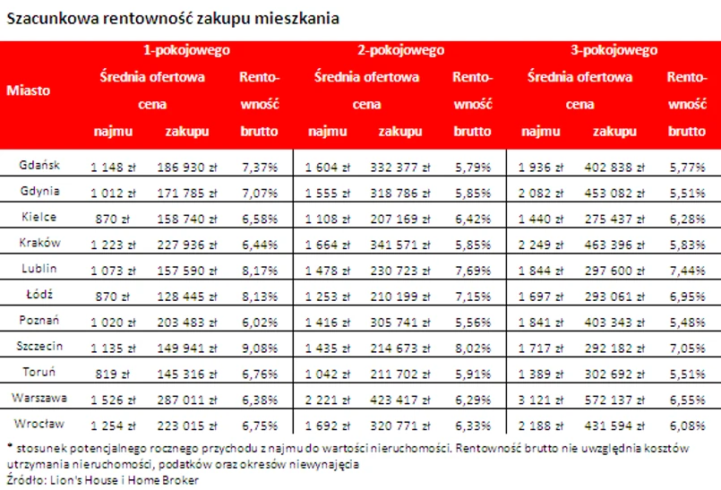 Powód jest prosty – jak wynika z danych Lion’s Banku przeciętne oprocentowanie kredytu hipotecznego nie przekracza 4,3%, a dane Lion’s House i Home Broker sugerują z kolei, że średnia rentowność wynajmu najpopularniejszych mieszkań dwupokojowych w dużych miastach wynosi obecnie 6,4% (w ujęciu brutto). W przypadku lokalu wartego 300 tys. zł oznacza to potencjalny roczny przychód z wynajmu na poziomie 19,2 tys. zł.