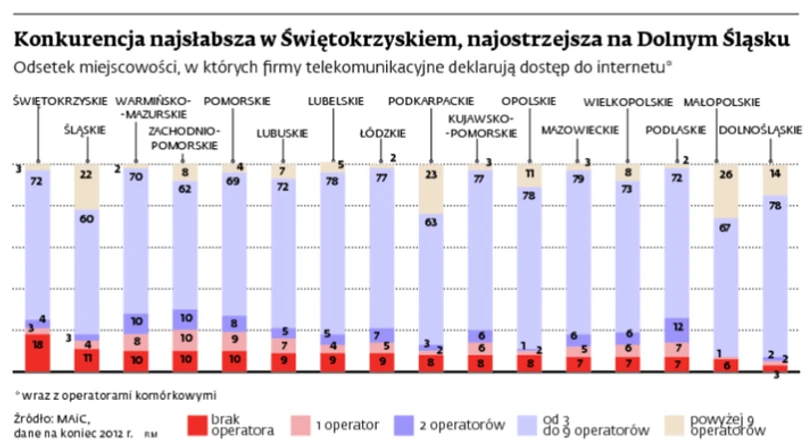Problem najczęściej dotyczy słabo zaludnionych regionów. Na przykład w województwie świętokrzyskim z internetu nie mogą korzystać osoby z 18 proc. miejscowości. Najgorsza sytuacja panuje w powiatach jędrzejowskim i starachowickim, gdzie w ok. 40 proc. miejscowości nie ma zasięgu żadnej sieci. W województwach śląskim, warmińsko-mazurskim oraz zachodniopomorskim w podobnej sytuacji jest mieszkaniec co dziesiątej miejscowości. W tym ostatnim regionie z żadną siecią nie połączą się osoby z 29 proc. miejscowości powiatu choszczeńskiego i około 24 proc. szczecineckiego. Najgorszy wynik UKE odnotował w położonym na południe od Krakowa powiecie suskim, gdzie ani jeden operator telekomunikacyjny nie zadeklarował dostępności swojej sieci aż w 50 proc. miejscowości.