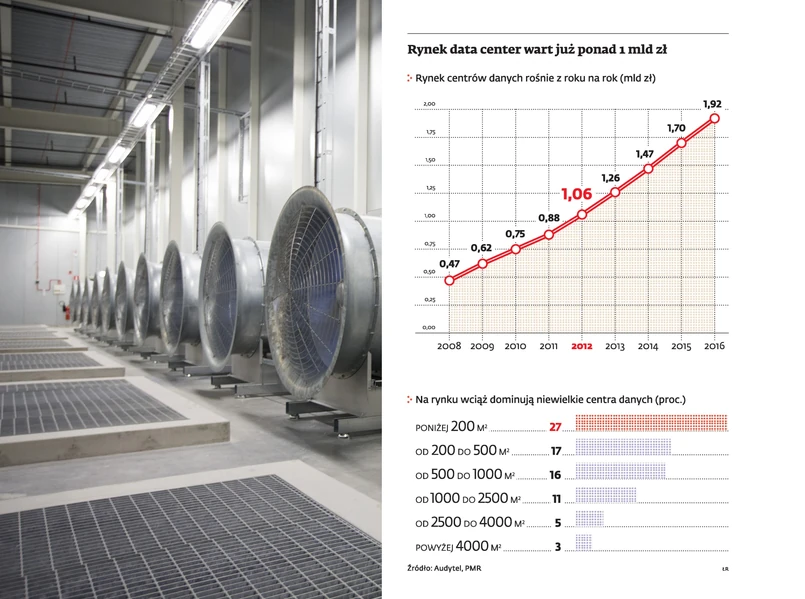 Pierwsze znaczące centra przetwarzania danych powstały w Polsce ponad 10 lat temu. Bardziej dynamiczny rozwój rynku zaczął się w latach 2009–2011. Do dziś tych naprawdę dużych wybudowano dopiero trzy. Ale boom w inwestycjach już widać. W maju swoje centrum – trzecie w Polsce – otworzyło IBM. Ośrodek zlokalizowany jest w Błoniu w okolicach Warszawy i ma blisko 3500 mkw. powierzchni. Netia waśnie zakończyła rozbudowę swojego centrum zlokalizowanego w Warszawie przy ul. Poleczki, a pod koniec ubiegłego roku Polkomtel ogłosił przetarg na swoje data center w Grodzisku Mazowieckim. Pod koniec tego roku ma zostać zakończona budowa ogromnego – bo o powierzchni aż 6300 mkw. – centrum w Poznaniu należącego do spółki Beyond.pl.
