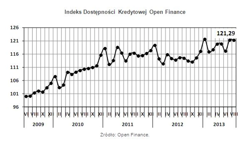 Obliczany każdego miesiąca przez Open Finance Indeks Dostępności Kredytowej (IDK), który obrazuje sytuację na rynku kredytów hipotecznych w złotych, spadł wprawdzie w sierpniu o 0,05 pkt (0,04 proc.), ale w ujęciu rok do roku wynik 121,29 pkt to o 5,97 proc. więcej niż w sierpniu 2012 roku. To ósmy miesiąc z kolei, w którym w ujęciu rocznym Indeks jest na plusie. To efekt cięć stóp procentowych przeprowadzonych przez Radę Polityki Pieniężnej (stopy obniżane były ośmiokrotnie, łącznie o 225 pb). Z takim okresem wzrostu dostępności kredytów nie mieliśmy do czynienia od zimy 2011/2012.