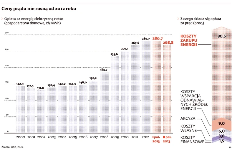 Enea, do której należy najpotężniejsza elektrownia na węgiel kamienny w Kozienicach, podała, że stawki, po których sprzedaje energie z dostawa, w 2014 r. obniża się do 155–165 zł za MWh z poziomu 180–190 zł w 2013 r. – Przestrzeń do obniżki cen energii jest zawsze – kwituje Marek Woszczyk, prezes URE. O co idzie gra? Dzisiaj przeciętna rodzina płaci za prąd ok. 150 zł miesięcznie, ale połowa faktury to opłaty za dostarczenie energii. Ostatnia obniżka średnio o 4,25 proc. pozwoli przez pół roku zaoszczędzić ok. 19 zł. Dobre i to. Utrzymywanie stawek za energie na najniższym możliwym poziomie to dziś priorytet rządu, który w pamięci ma ubiegłoroczny upadek gabinetu w Bułgarii z powodu wysokich rachunków za energię elektryczna.
