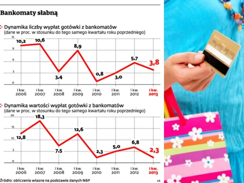 W ciągu kwartału Polacy korzystają z bankomatów ponad 180 mln razy. Wypłacają w ten sposób 66 mld zł. Jeszcze w 2005 r. wykonywaliśmy kwartalnie 116 mln wypłat na sumę 37 mld zł. Ale wzrost jest coraz wolniejszy. O ile jeszcze kilka lat temu popularność bankomatów wzrastała w tempie kilkunastu procent rocznie (ponad 10 proc. w przypadku liczby i prawie 20 proc. w przypadku wartości transakcji), o tyle obecnie liczba wypłat gotówki rośnie w tempie niecałych 4 proc., a ich wartość zwiększa się o niewiele ponad 2 proc. rocznie.