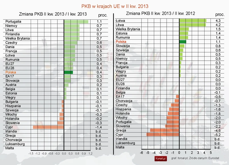 W drugim kwartale prymusem w UE była Portugalia (ze wzrostem o 1,1 proc.) w ujęciu kwartalnym. Natomiast Niemcy, Litwa, Finlandia i Wielka Brytania miały 0,7 proc. wzrostu. Największe spowolnienie odnotowały Cypr (-1,4 proc.), Słowenia (-0,3 proc.), Włochy i Holandia (po -0,2 proc.).