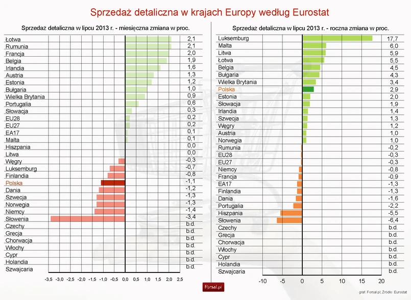 W badanym miesiącu najbardziej zmniejszyły się konsumpcja na Słowenii (sprzedaż detaliczna spadła o 6,4 proc. r/r), w Hiszpanii (spadek o 5,5 proc.) oraz w Portugalii (spadek o 2,2 proc.). Rekordzistą w lipcu okazał się Luksemburg. Sprzedaż detaliczna rok do roku wzrosła tutaj o 17,7 proc.