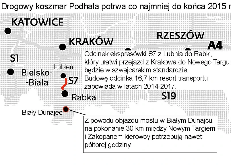 Z powodu utrudnień w Białym Dunajcu na pokonanie 30 km między Nowym Targiem i Zakopanem kierowcy potrzebują nawet półtorej godziny. Czy zimą na narty do Zakopanego można dojechać inaczej niż zakorkowaną droga nr 47? Są dwie możliwości. Kierowcy mogą nadłożyć drogi, odbijając na Czarny Dunajec (drogą nr 958) albo Bukowinę Tatrzańską (960 i 961). Ale jest minus: jeśli na te wąskie drogi zjadą kierowcy z zakopianki, dojdzie do paraliżu. Lokalne samorządowe obawiają się, że efektem ubocznym problemów transportowych może być zmniejszenie liczby turystów w tym rejonie Polski.