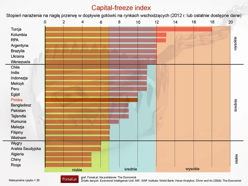 The Economist stworzył capital-freeze index, zestawienie rynków rozwijających się najbardziej narażonych na niespodziewany kryzys kredytowy, czyli de facto najmniej samodzielnych finansowo. Pod uwagę wzięto cztery czynniki.