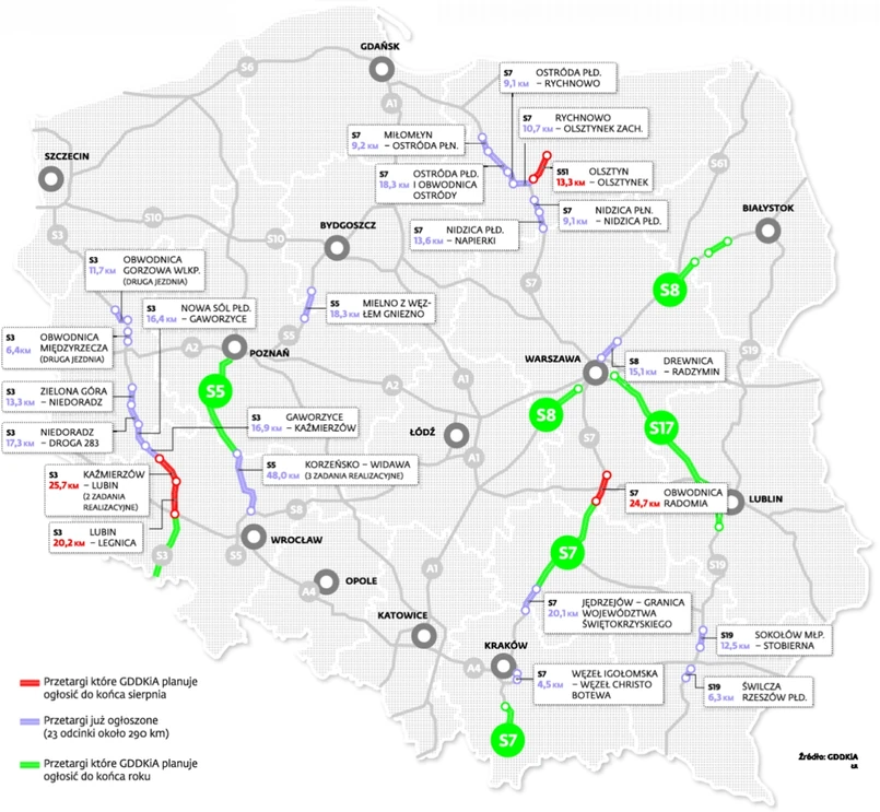 "W pierwszej turze przetargowej, trwającej do końca sierpnia, GDDKiA ogłosiła już 26 postępowań na budowę ponad 370 km dróg ekspresowych. Od dziś do końca roku systematycznie będą ogłaszane kolejne przetargi. W sumie, zgodnie z planem, do końca roku ogłosimy postępowania na budowę ponad 730 km dróg ekspresowych, na łączną kwotę ponad 35 mld zł. Zainteresowanie ogłoszonymi dotychczas przetargami jest bardzo duże, w wielu przypadkach startują wykonawcy nieobecni dotąd na budowach nadzorowanych przez GDDKiA" - czytamy w komunikacie.