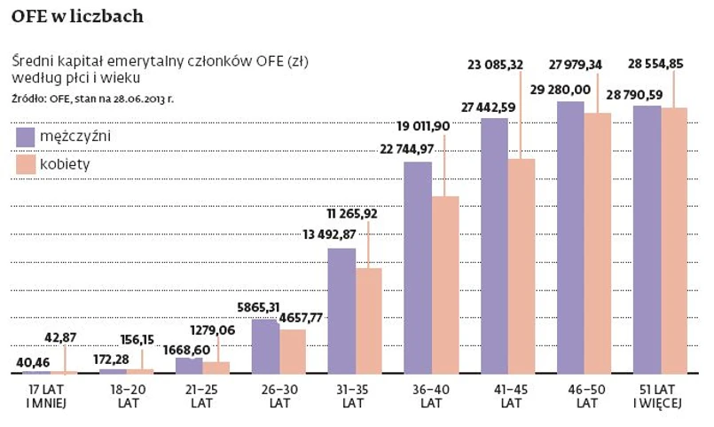 - Kolejne ważne rozstrzygnięcie dotyczy tak zwanego suwaka. Chodzi o procedurę systematycznego przekazywania oszczędności z konta ubezpieczonego w OFE do ZUS. Ma być ono prowadzone w ciągu 10 lat przed osiągnięciem wieku emerytalnego. Proces ten ma zabezpieczyć oszczędności przed wahaniami na rynkach finansowych. Jak wynika z informacji zebranych przez DGP, w resortach pracy i finansów zapadła decyzja, że w ramach suwaka OFE nie będą mogły przekazywać papierów wartościowych, ale jedynie gotówkę. To rzutuje na oszacowanie przepływów pieniężnych między OFE a ZUS w kolejnych latach. Tym samym pokazuje, ile pieniędzy fundusze będą miały na inwestowanie. Transfery wynikające z suwaka będą odliczane od przekazywanej do OFE składki. Tylko w pierwszym półroczu 2014 r. wpłynie do OFE 6 mld zł składki. Ile trafi tam w drugiej połowie roku, zależy od tego, ile osób pozostanie w OFE. Natomiast OFE będą musiały przekazać w ramach suwaka 4,4 mld zł. Czyli zostanie im co najmniej 1,7 mld zł i te pieniądze będą mogły inwestować. Zdaniem Jakuba Borowskiego, głównego ekonomisty Credite Agricole, w przyszłym roku może się ujawnić niekorzystny wpływ zmian w OFE na giełdę. – Jeśli trzy czwarte ubezpieczonych wybierze ZUS, a nie OFE, to w skrajnym wariancie odpływ netto pieniędzy OFE z giełdy w przyszłym roku może wynieść nawet 0,5 mld zł – ocenia ekonomista. W kolejnych latach transfery w ramach suwaka będą nieco niższe, w granicach 2–3 mld zł. To oznacza, że gdyby w OFE została tylko jedna czwarta ubezpieczonych, to i tak fundusze nie będą musiały pozbywać się aktywów, by do ZUS płynęły pieniądze. Nie będą miały jednak nowych pieniędzy na inwestycje.