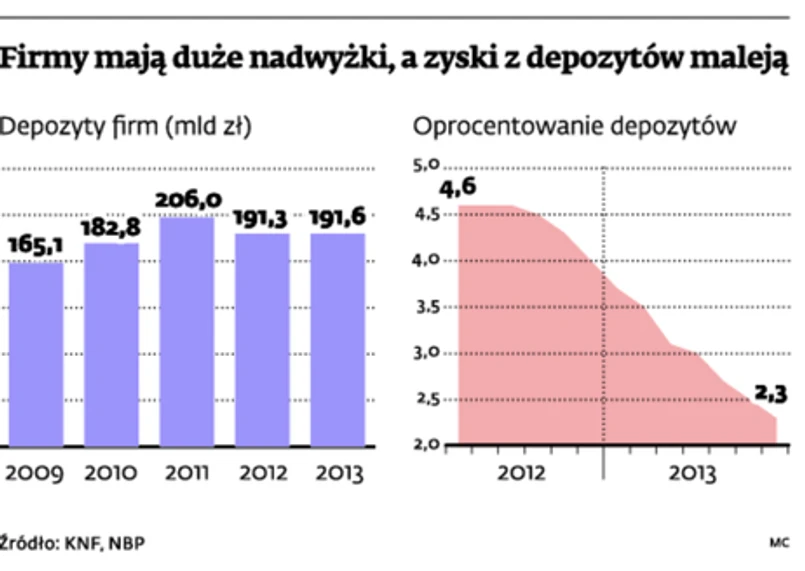 Z danych Komisji Nadzoru Finansowego wynika, że przedsiębiorstwa na depozytach trzymają ponad 190 mld zł. Nie wiadomo, ile z tego ulokowane jest w produktach strukturyzowanych. Ale w bankach, które oferują te instrumenty, stanowią one od 1 do 5 proc. całości nadwyżek posiadanych przez biznes. Ich udział może rosnąć, bo oprocentowanie depozytów złotowych tylko nieznacznie przekracza 2 proc. w skali roku. W przypadku lokat w dolarach czy euro, z których często korzystają importerzy i eksporterzy, odsetki są jeszcze niższe – wynoszą kilka dziesiątych procent. Wiele firm szuka więc innych, atrakcyjniejszych sposobów przechowywania nadwyżek finansowych, a struktury mogą być odpowiedzią na to zapotrzebowanie.