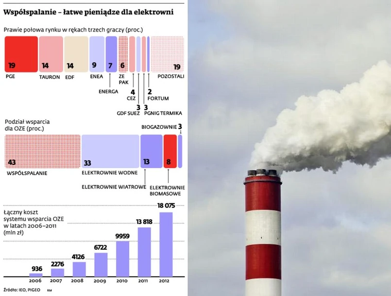 Liderami we współspalaniu biomasy są PGE i Tauron (grupy energetyczne pod kontrolą Skarbu Państwa) oraz francuski EDF. Elektrownie należące do tych trzech graczy mają połowę udziałów w rynku, a to oznacza, że tylko w 2012 r. zainkasowały z tego tytułu ok. 1 mld zł. Do kieszeni wszystkich firm wykorzystujących współspalanie w latach 2006–2012 trafiło łącznie 43 proc. wsparcia, którego wielkość wyniosła w tym czasie ok. 18 mld zł. Swój udział w puli mają jeszcze państwowe Enea i Energa, kontrolowany przez Zygmunta Solorza Zespół Elektrowni PAK, francuskie GDF Suez i Dalkia, czeski CEZ, a także fińskie Fortum.