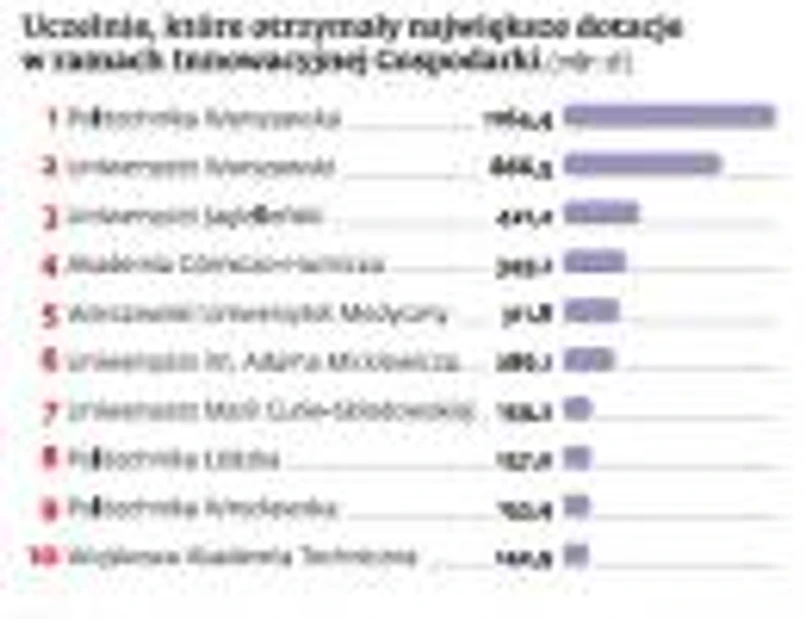 Na liście 30 największych beneficjentów Programu Operacyjnego Innowacyjna Gospodarka (PO IG) niemal co trzeci to uczelnia państwowa. Rekordzistą jest Politechnika Warszawska, która otrzyma na 32 projekty dofinansowanie z Unii w wysokości niemal 1,2 mld zł. W sumie w tej perspektywie finansowej (2007–2013) na budowę i wyposażenie instytutów naukowych oraz na nowe kierunki badań wykorzystano ok. 27 mld zł.