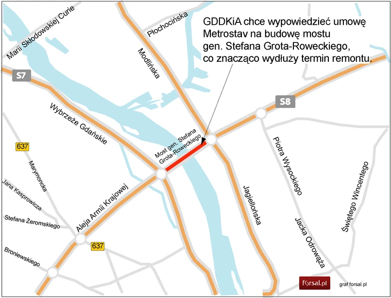 Drugi problem: do udziału nie palą się podwykonawcy, bo kontrakt obarczony jest dużym ryzykiem. Mostem Grota jeździ w ciągu doby ponad 140 tys. aut, a prace będą odbywały się pod ruchem (ze zwężaniem jezdni, ale bez zamykania). Dużą niewiadomą jest stan techniczny przeprawy, który zostanie zweryfikowany dopiero po zerwaniu nawierzchni. Specjaliści spodziewają się, że zakres prac będzie większy od tego, co zakładał projekt wykonany przed laty na zlecenie GDDKiA.