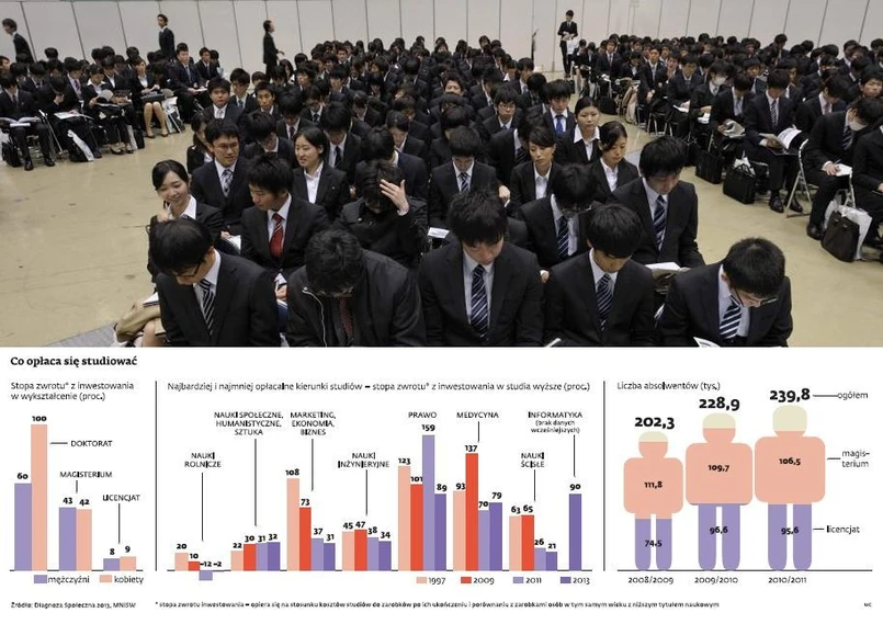 Według Diagnozy Społecznej w Polsce i tak o wiele korzystniej jest inwestować w wykształcenie niż w krajach o podobnym poziomie rozwoju. Najsłabiej ta sytuacja wygląda w przypadku licencjatów – ich opłacalność systematycznie spada. Według ubiegłorocznych badań Ernst & Young osoby z wyższym wykształceniem na poziomie magistra zdobywają pracę w 78,8 proc. Absolwenci z tytułem licencjackim – o 15 proc. rzadziej.